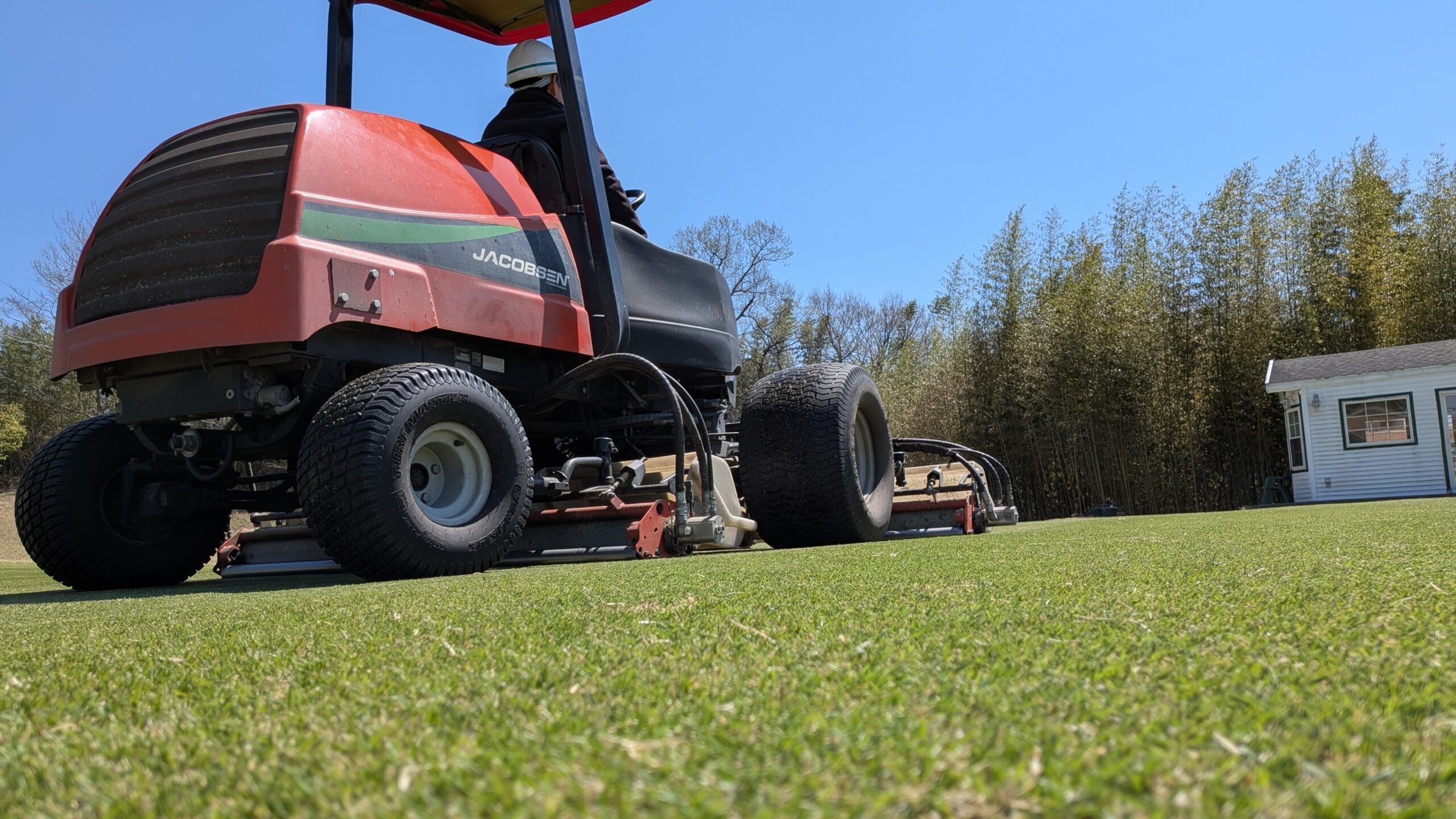 芝が動き始めたのでティー・フェアウェイの刈込作業を開始しました